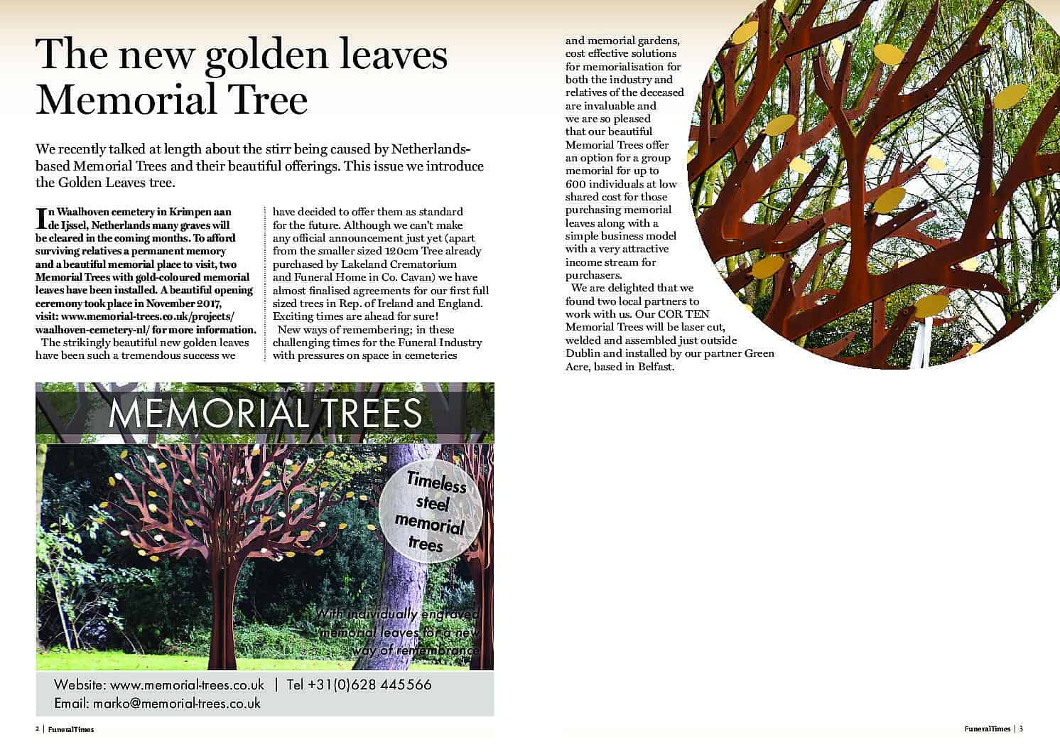 Funeral Times Ireland (Feb 2018 Vol.18 No.1) Categories In the press09-05-202104-02-2018 «We recently talked at length about the stir being caused by Netherlands based Memorial Trees and their beautiful offerings. This issue we introduce the Golden Leaves tree….» Read the FT Ireland Feb 2018 golden leaves …