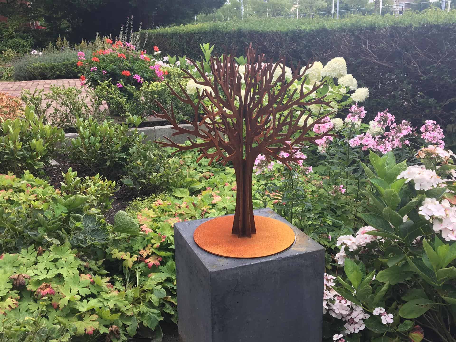 The small memorial tree is a beautiful monument to remember the departed. If desired, a leaf can be supplied with the name, and date of birth and death. The leaf is placed on the base plate of the memorial tree.